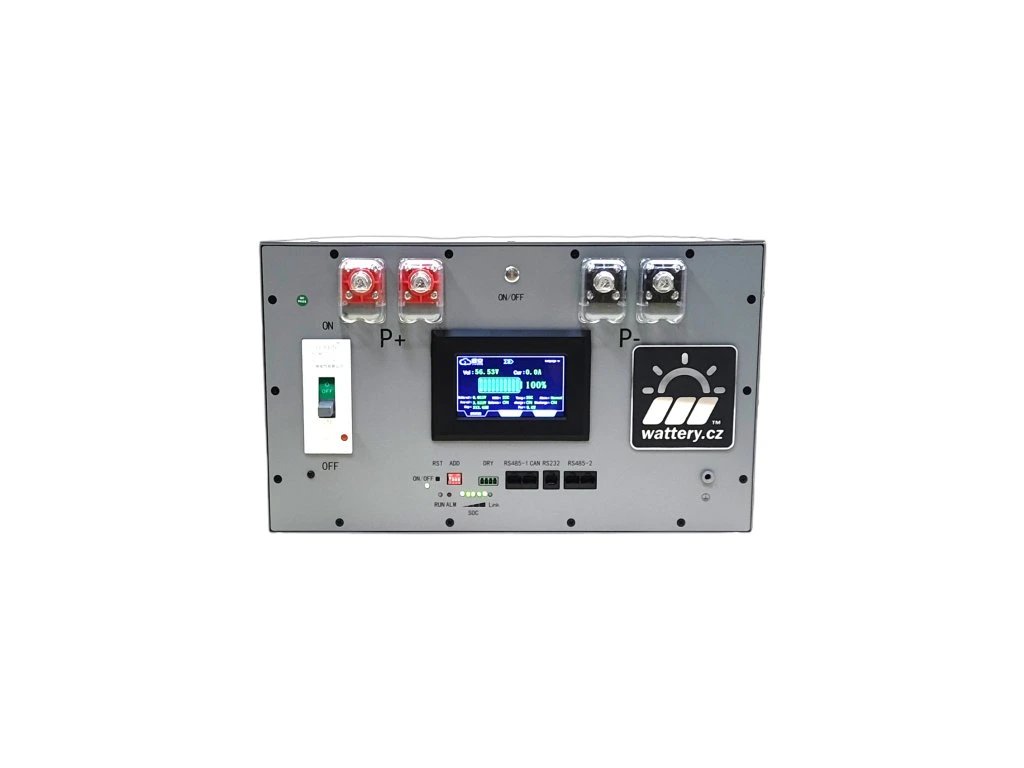 Česká nízkonapěťová baterie LiFePo4 řady "Smart" o kapacitě 16kWh vhodná pro FVE (fotovoltaické elektrárny) a BESS (battery energy storage system). Uložiště má dva přednastavené DRY kontakty, které spínají při hodnotě nabití baterie < 50% a < 90%, na kontakty lze připojit wifi relé TUYA nebo SONOFF a řídích chytré zásuvky v aplikaci Smart Life.